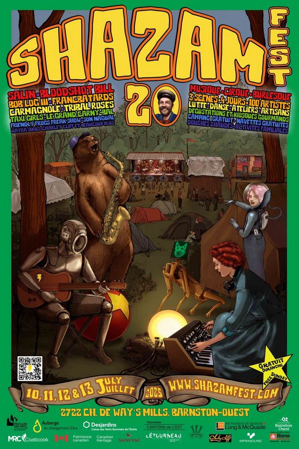 ShazamFest est une célébration excentrique de musique, de cirque, d’arts de la scène et de communauté au Québec. Son originalité n’a probablement pas d’égale chez nous. Cet incroyable carnaval de quatre jours se déroule sur une ferme biologique pionnière, non loin de la vallée de Coaticook. Le festival, qui entame sa 20e édition, continue d’allier l’extravagance et le plaisir de l’effroi à un engagement irréductible pour l’inclusion, la durabilité et la culture DIY. Du 10 au 13 juillet, une multitude de découvertes en tout genre : numéros de cirque aérien, marionnettes géantes, installations interactives, activités pour jeunes, musique déchaînée, festins de nourriture locale, camping gratuit, soirées dansantes interstellaires et beaucoup plus. Véritable rassemblement populaire, le ShazamFest est l’endroit où les exclus sont inclus et où tout le monde – enfant, aîné·e, artiste, musicien et rebelle – est invité à jouer, à s’exprimer et à créer un peu de magie en pleine nature.