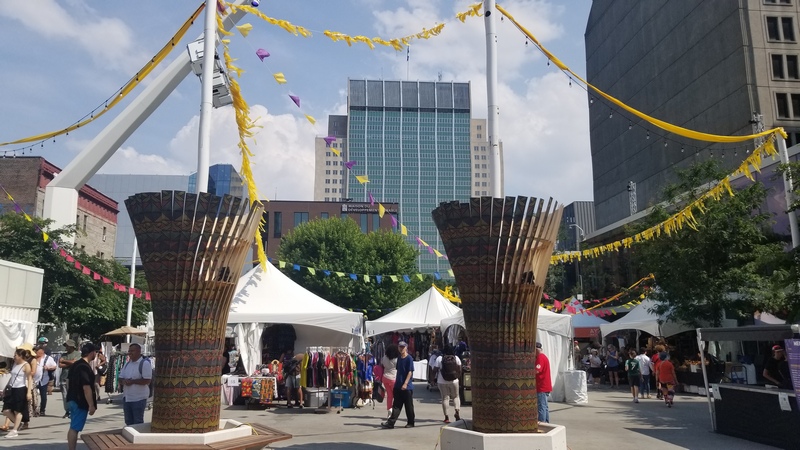Les visiteurs peuvent sillonner ce marché aux couleurs et aux saveurs africaines. La musique est partout lors de ce 39e festival des Nuits d’Afrique, tout le temps avec les concerts présentés en alternance sur les deux scènes extérieures du site qui s’étend de la rue Ontario à la rue Sainte-Catherine.