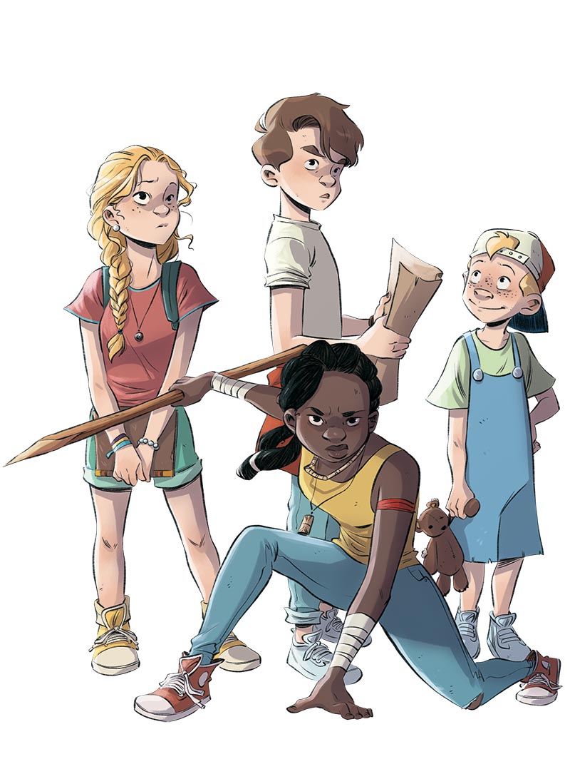 L’île de minuit[1] est une bande dessinée qui met au défi quatre enfants armés de courage. Elena, Maya, Hector et Elijah se réveillent, amnésiques, sur une île abandonnée. S’ils se souviennent bien de leurs noms, ils n’ont aucun souvenir de leur passé, ni de la manière dont ils se sont retrouvés sur cette île perdue.