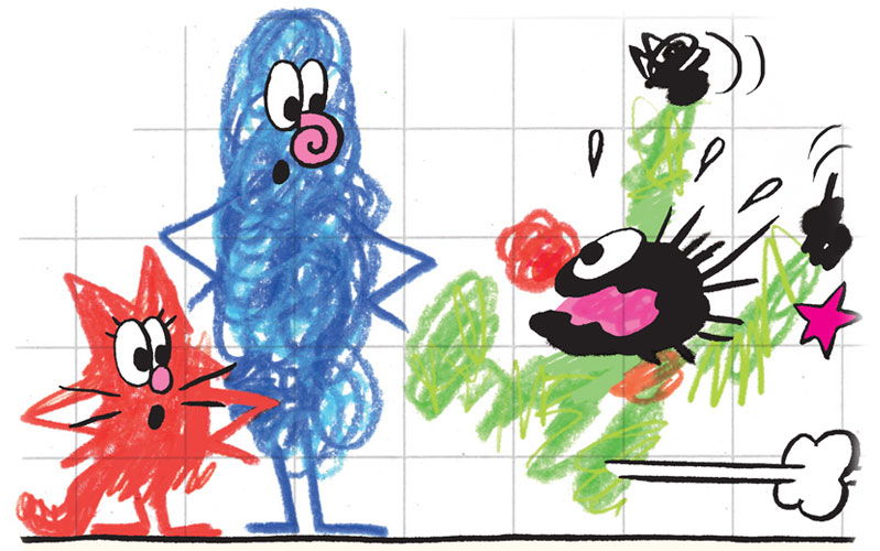 À la veille de cette entrée scolaire, les deux auteurs entraînent ce personnage joyeux sur la voie de l’apprentissage. Il ramasse sur son chemin une gomme à effacer. Emporté par son enthousiasme, il taille un crayon géant puis plonge dans le tas de copeaux de bois avant de s’engouffrer dans un monde de gribouillis où il s’apprête à vivre une aventure en compagnie de deux magnifiques dingos : Gribouillis et Kraboutchat.