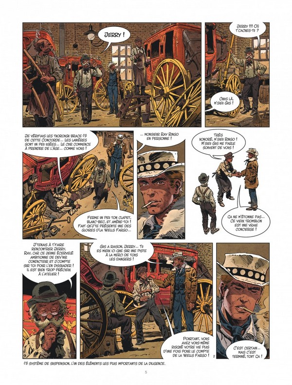 Ringo se rend à New-York pour présenter sa démission à la Wells Fargo. S’adressant à son employeur, il ne peut accepter que la compagnie réduise le nombre de convoyeurs, ce qui expose les convois à de nombreux risques : « Je vais vous dire ce que je préfère Monsieur Fargo…je préfère des conducteurs et des voyageurs qui voyagent en toute sécurité et qui arrivent à destination en un seul morceau…et je préfère renoncer à mon travail si la compagnie qui m’emploie n’est plus capable d’assurer ça! Vos diligences ont encore de beaux jours devant elles, Monsieur! Les gens préfèrent la route car ils ont confiance en nous…et il en va de même des banques! Seulement voilà : moins de convoyeurs signifie plus de risques…et plus de risques signifie plus de morts! » (Page 7).