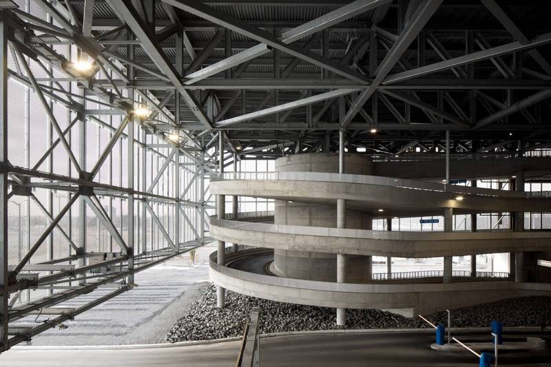 La taille imposante du bâtiment a été mise à profit pour concevoir une expérience subtile et nuancée. La structure de béton est recouverte d’une enveloppe semi-transparente en aluminium. Cette enveloppe de métal devient un écran animé par les phares et la circulation des voitures qui se déplacent dans le stationnement. Agissant comme une immense toile de projection, l’enveloppe atteint une dimension épique avec une façade de 896 mètres de long et de 18 mètres de haut, incluant une portion importante qui se projette vers l’autoroute adjacente au sud. La chorégraphie des véhicules s’imprime sur la surface du bâtiment qui s’illumine et se diffuse dans son environnement.